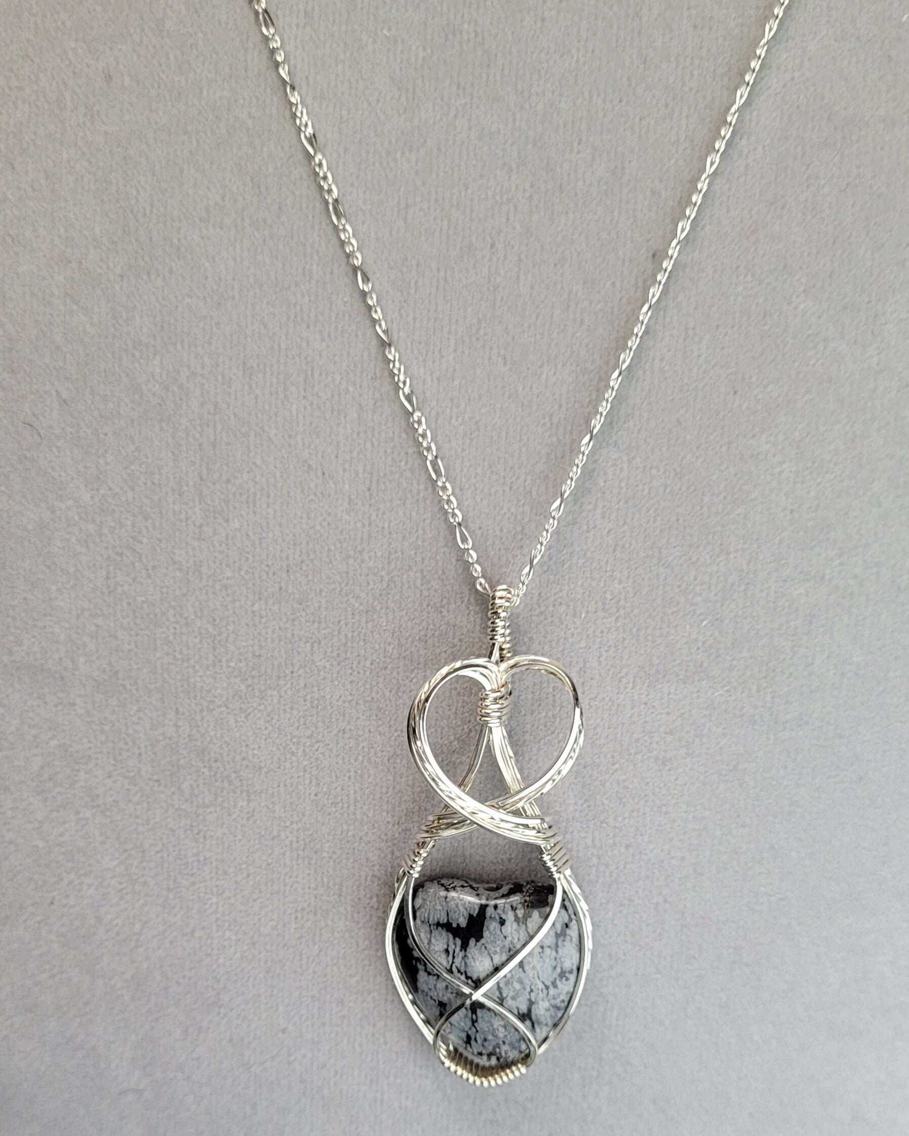 .925 Sterling Silver chain 18" long with a wire sculpture heart and a snowflake obsidian heart pendant.