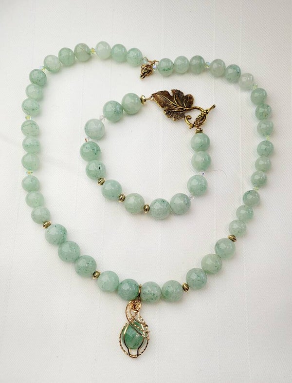 Aventurine gemstone is a money stone! This set has 14kt gold with wire sculpture pendant.
